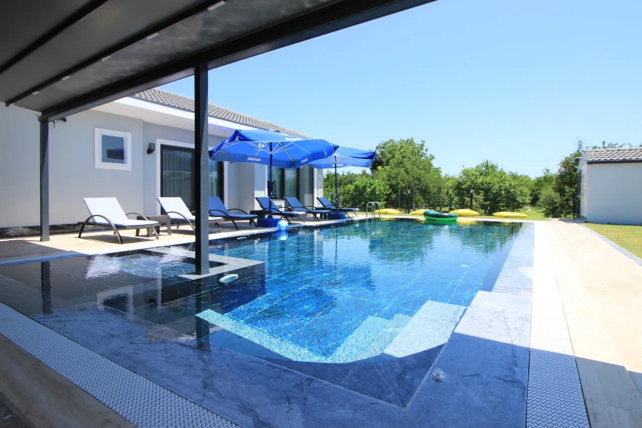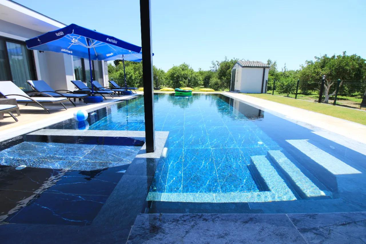 Villamızın en büyük ayrıcalıklarından biri olan 55 m² genişliğindeki (1,55 m derinlik) özel yüzme havuzu, klor veya kimyasal kullanılmadan tamamen tuz ile dezenfekte edilmektedir. Havuz içerisindeki ayarlanabilir hidromasaj sistemi sayesinde suyun rahatlatıcı etkisini maksimumda yaşarken, her sabah erken saatlerde görevli personelimiz tarafından yapılan düzenli bakımla güne her zaman tertemiz bir havuzla başlayacaksınız.