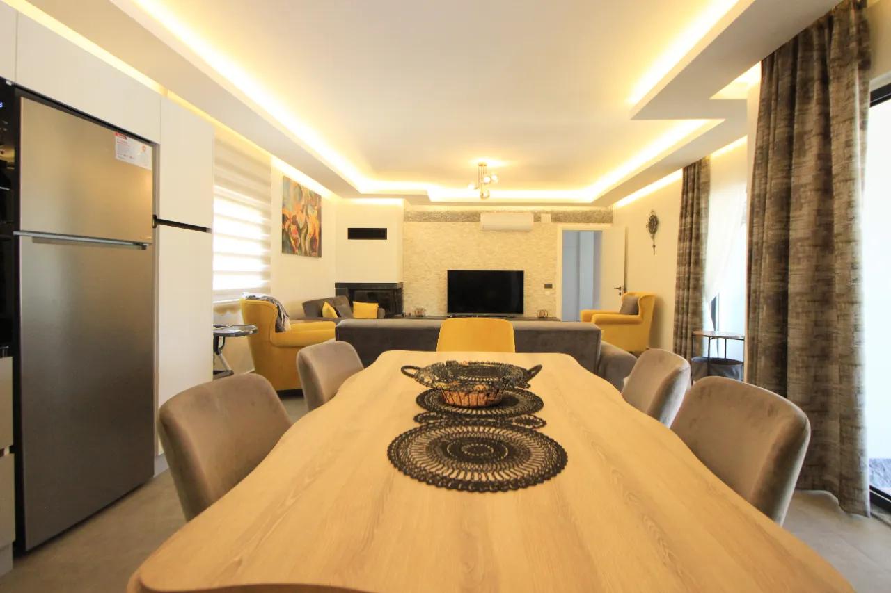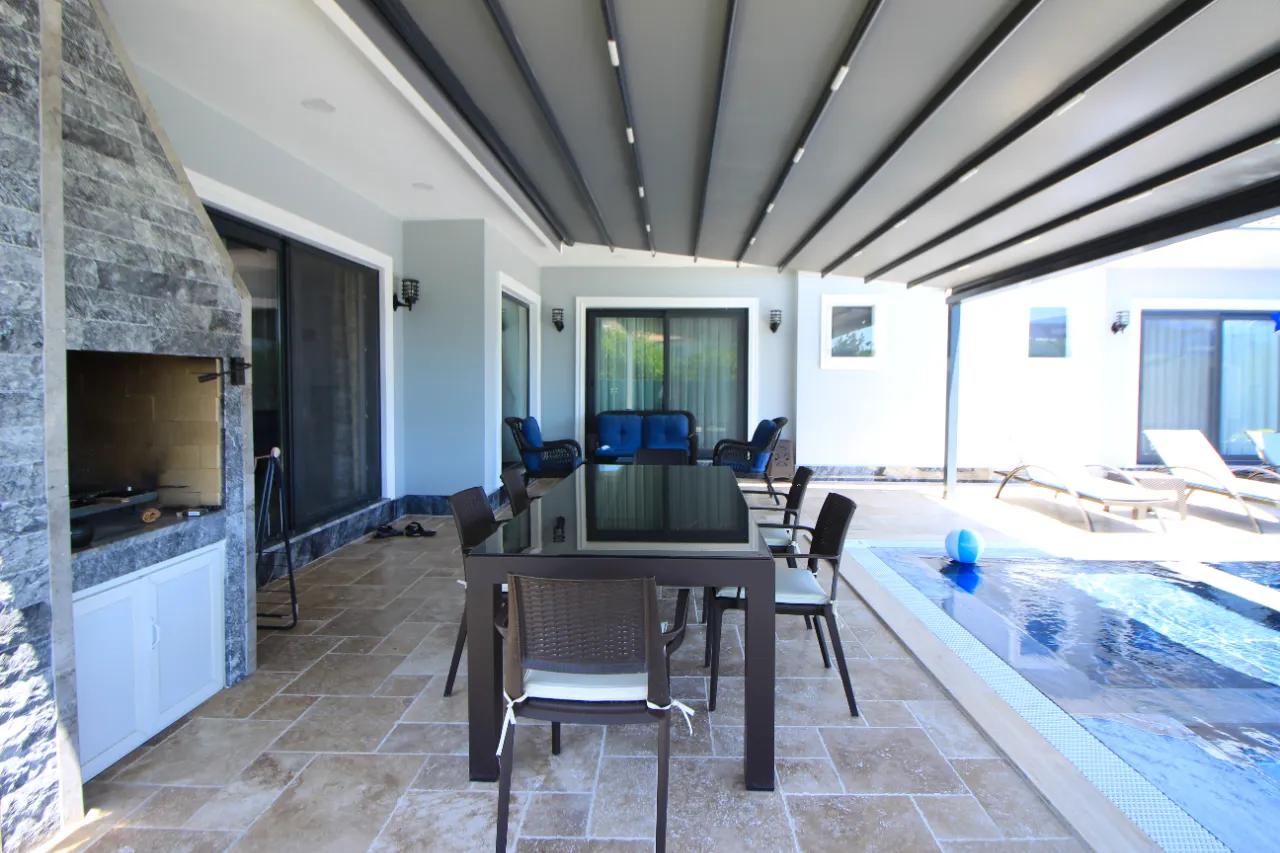 - Salon: Havuz terasına doğrudan açılan ferah salonda; konforlu oturma grubu, şömine, klima ve uydu alıcılı büyük ekran akıllı TV ile keyifli akşamlar sizi bekliyor.